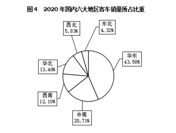 2020年,從國內(nèi)六大地區(qū)客車銷售情況來看(注2),與上年相比,華東地區(qū)銷量增長最為明顯,共銷售15.26萬輛,同比增長15.33%,增速高于上年13.72個百分點;華北地區(qū)結(jié)束上年下降呈小幅增長,共銷售4.71萬輛,同比增長6.87%;中南地區(qū)降幅有所收窄,共銷售7.25萬輛,同比下降11.06%,降幅比上年收窄6.03個百分點;西南和西北地區(qū)結(jié)束上年增長,有所下降,分別銷售4.24萬輛和2.04萬輛,同比下降8.07%和11.28%。東北地區(qū)降幅比上年明顯擴大,共銷售1.51萬輛,同比下降22.44%,降幅比上年擴大20.71個百分點。