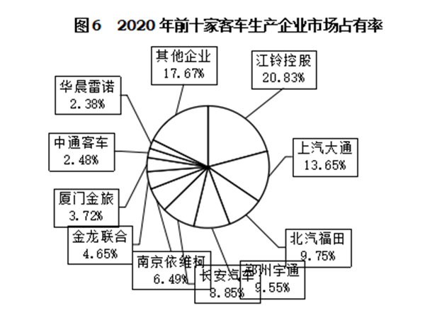 2020年,行業(yè)內(nèi)骨干企業(yè)依然保持較高市場占有率,其中客車銷量排名位居前十位的企業(yè)依次是:江鈴股份、上汽大通、北汽福田、鄭州宇通、長安汽車、南京依維柯、金龍聯(lián)合、廈門金旅、中通客車和華晨雷諾,分別銷售9.11萬輛、5.97萬輛、4.27萬輛、4.18萬輛、3.87萬輛、2.84萬輛、2.03萬輛、1.63萬輛、1.08萬輛和1.04萬輛。與上年相比,排名前三強企業(yè)市場表現(xiàn)較為突出,銷量同比均呈較快增長,其中上汽大通增速尤為顯著,南京依維柯增速也超過10%,其他六家企業(yè)均呈下降,華晨雷諾降幅更明顯。2020年,上述十家企業(yè)共銷售36.01萬輛,占客車銷售總量的82.33%。