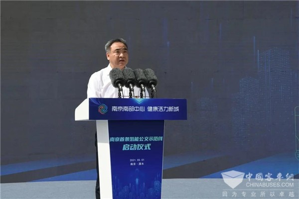 2021年5月1日上午9點,南京市首條氫能源公交示范線啟動儀式在開沃新能源汽車集團隆重舉行,南京市政府副秘書長陶磊,溧水區(qū)長張?zhí)N,溧水區(qū)委常委、常務(wù)副區(qū)長邰倫浩以及開沃集團副董事長丁星勝、副總裁諸萍、副總裁江民等領(lǐng)導(dǎo)一同出席。此次氫能源公交示范線的開通將投放11輛NJL6106FCEV開沃氫燃料城市客車,并建設(shè)南京首個商業(yè)化加氫站,解決氫氣儲運和加注問題。