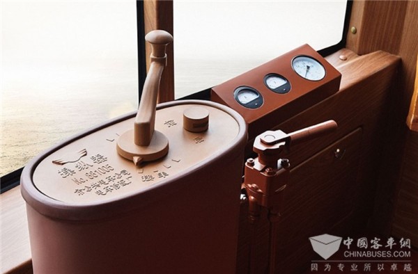 外觀上看,銀隆仿古鐺鐺車有8.5米、10.5米、12米三種米段,車輛通常采用兩種涂裝配色,一種以郵差綠和芥末黃為主,另一種以棗紅色與暗黃色為組合。車輛外形模仿民國時期有軌電車,內(nèi)飾也幾乎原樣復(fù)制。座椅仿皮面、棕紅色的木地板、鏤空的頂燈,造型古樸別致,懷舊氣息撲面而來。車廂尾部仿照老電車,設(shè)有仿制的儀表盤和手柄,上方掛有一銅鈴,到站一拽,“鐺鐺”作響。似從歷史之中穿越而來,復(fù)古典雅,獨具韻味。