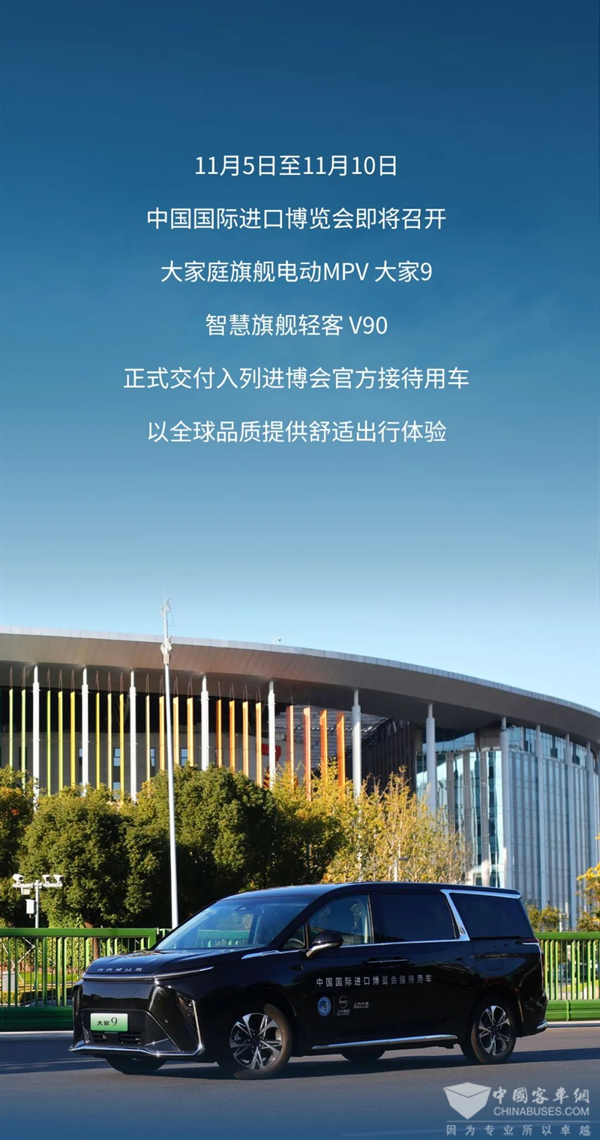 2023年11月5日至11月10日,中國國際進(jìn)口博覽會即將召開,大家庭旗艦電動MPV大家9,智慧旗艦輕客V90,正式交付入列進(jìn)博會官方接待用車,以全球品質(zhì)提供舒適出行體驗(yàn)。