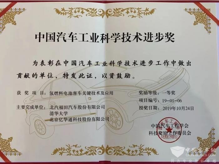 福田歐輝氫燃料電池客車技術榮獲中國汽車工業(yè)科技進步獎一等獎