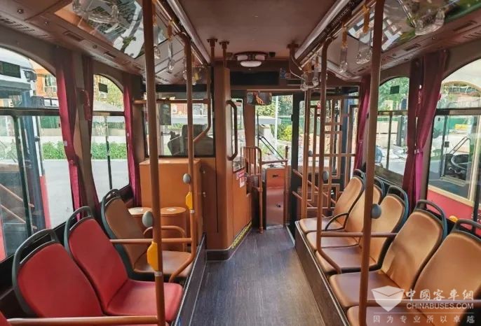 即將投運的“鐺鐺車”均為金龍新能源純電動公交車,節(jié)能環(huán)保,安全舒適。此款金龍純電“鐺鐺車”采用復(fù)古式、民國風(fēng)的內(nèi)外觀造型,進(jìn)入車廂就恍若穿越回上個世紀(jì),車內(nèi)寬敞明亮,暗色地板與棕紅的仿皮座椅相互襯托,內(nèi)飾扶手和拉環(huán)均采用仿古設(shè)計,車廂尾部還有一處模擬民國時期鐺鐺車的駕駛臺,讓游客進(jìn)行深度體驗。