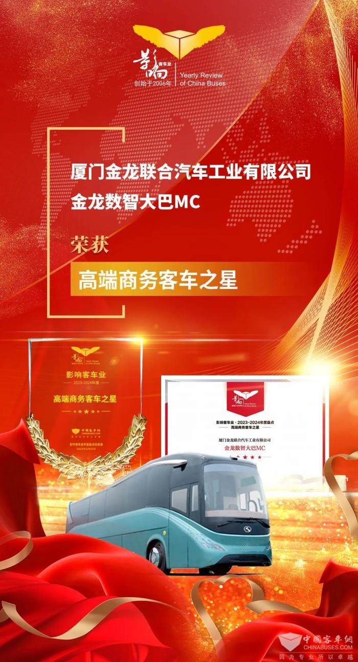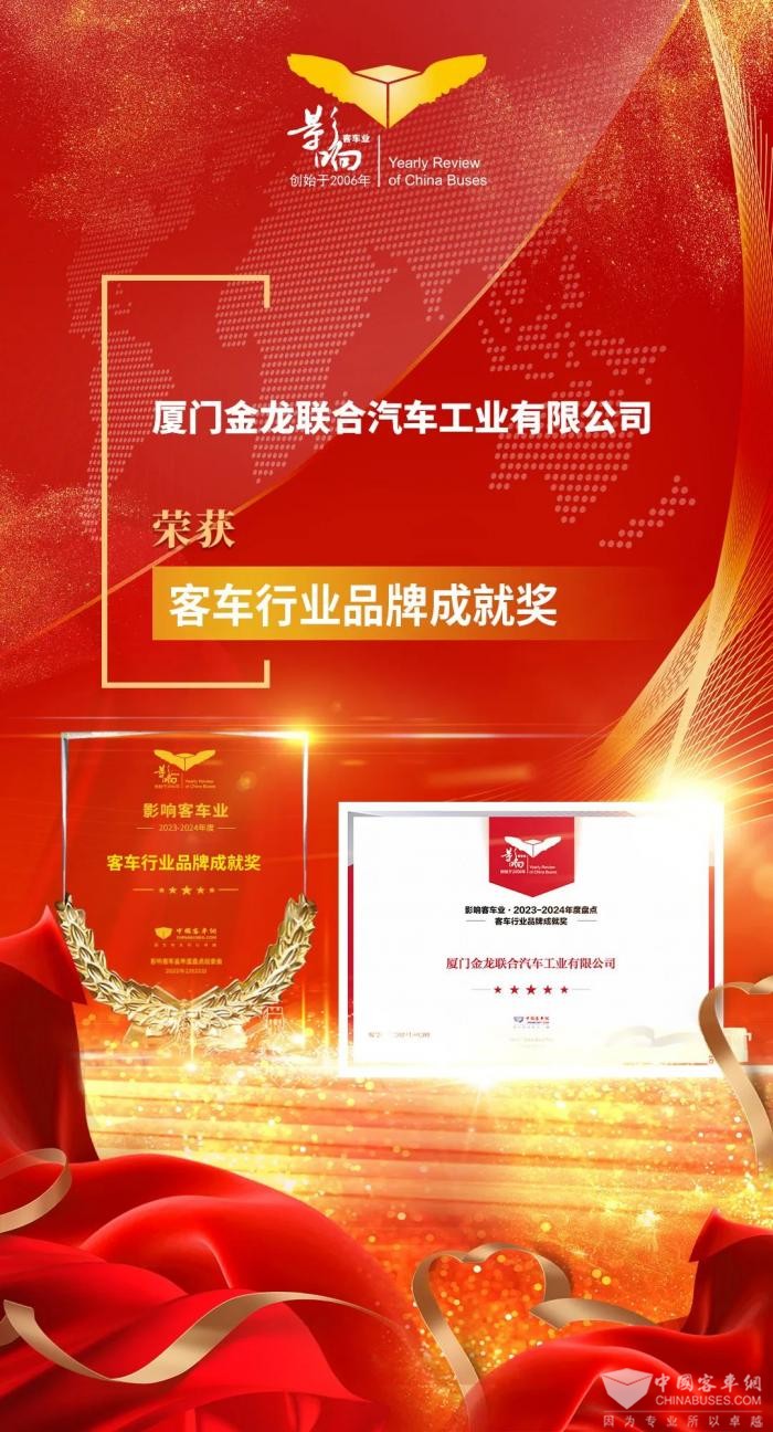近日,由中國客車網(wǎng)聯(lián)合中國土木工程學會城市公共交通分會聯(lián)合主辦的第十八屆影響客車業(yè)年度盤點頒獎典禮在合肥舉行。經(jīng)過影響客車業(yè)活動組委會綜合專業(yè)讀者投票和專家評委評審,金龍榮獲2023-2024年度“客車行業(yè)品牌成就獎”和“高端商務客車之星”兩項大獎,展現(xiàn)了響譽全球的中國客車品牌影響力。