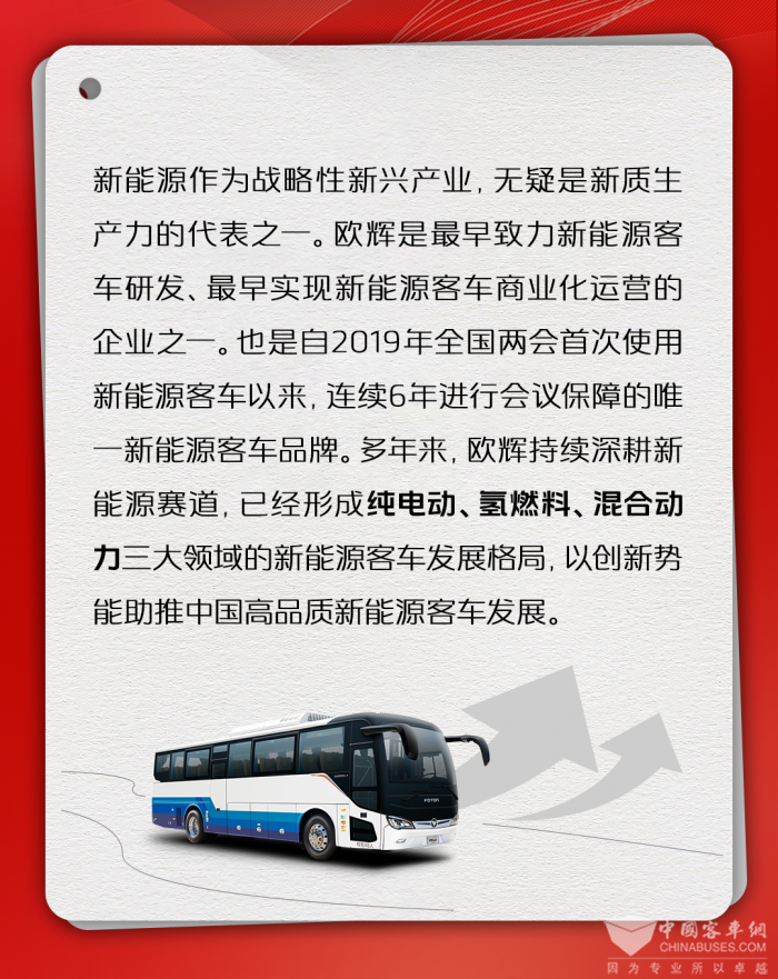 2024年全國兩會順利閉幕,福田歐輝完成“連續(xù)20年圓滿護航兩會任務(wù)”硬核質(zhì)檢。2024年兩會期間,新質(zhì)生產(chǎn)力、科技自立自強、綠色低碳等關(guān)鍵詞頻頻“刷屏”。作為中國綠色客車創(chuàng)領(lǐng)者,歐輝深刻踐行政府工作報告中相關(guān)發(fā)展要點,與國家關(guān)鍵性導(dǎo)向同向同行,引領(lǐng)中國客車行業(yè)高質(zhì)量發(fā)展。