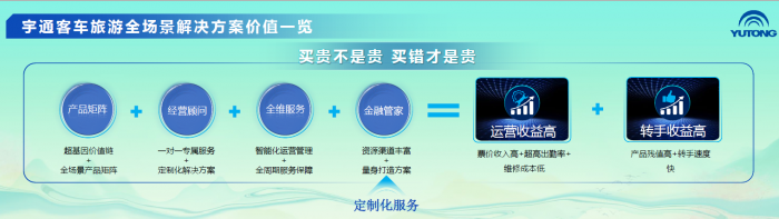 旅游全場(chǎng)景解決方案是宇通客車多年來關(guān)注用戶需求、聚焦客戶體驗(yàn)的智慧結(jié)晶。其中,產(chǎn)品矩陣:宇通已實(shí)現(xiàn)5-13米全米段、7-56座全車型布局;經(jīng)營(yíng)顧問:宇通精準(zhǔn)識(shí)別客戶運(yùn)營(yíng)場(chǎng)景與真正需求,可提供銷售、交付、使用全程服務(wù);全維服務(wù):宇通擁有一站式服務(wù)保障解決方案,并可提供智慧運(yùn)營(yíng)管理解決方案,保障客戶運(yùn)營(yíng)更高效,效益更長(zhǎng)遠(yuǎn);金融管家:宇通滿足客戶個(gè)性化、差異化的融資需求。