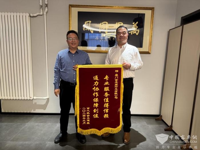 首汽旅游車公司黨委書記、經(jīng)理金龍向金旅國內(nèi)銷售公司常務副總經(jīng)理李紅斌頒發(fā)錦旗