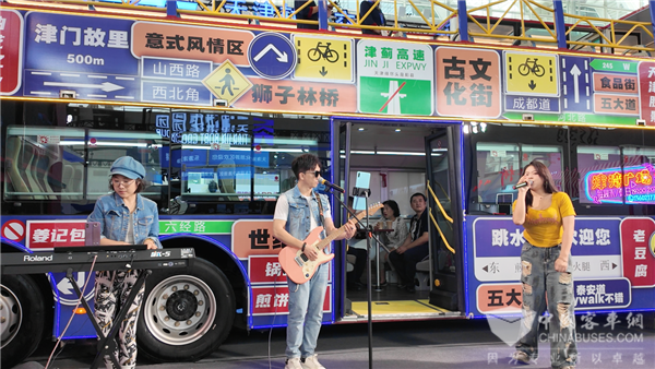 只見展臺上,這款網(wǎng)紅雙層巴士化身“音樂巴士”,車前樂隊駐唱、吉他手、還有電子琴鍵盤手合奏,悠揚(yáng)的旋律美妙動人,而海格雙層巴士新穎外觀設(shè)計賦予別樣風(fēng)情,車身上的天津路牌不僅展示了天津特色,也體現(xiàn)了這座城市的開放與包容。在小吃三絕、手工藝三絕和各區(qū)著名景點(diǎn)的襯托下,雙層巴士在整個展會上成為一道風(fēng)景線,引得觀展人士紛紛駐足合影留念。