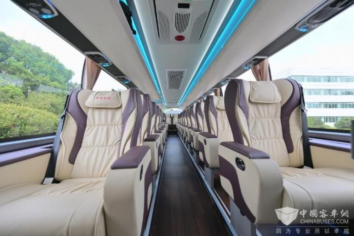 “做高端旅游,細節(jié)決定成敗。新V系客車內(nèi)像空調(diào)、行李架、冰箱、小吧臺這些細節(jié)滿滿的人性化設(shè)計,給乘客帶來了高端舒適的乘坐體驗。” 在配置確定時,秦學(xué)也有自己的考量,不求讓車處處先進,但求讓人處處滿意。1+1的座椅布局搭配符合人體曲線的乘客椅,為乘客提供最優(yōu)質(zhì)的出行體驗;靠窗處設(shè)置軟包小吧臺、杯托,方便乘客放置水杯、手機等隨身物品;貫通式行李架增加儲物空間,提高行李放置的便利性;整車內(nèi)飾顏色搭配和照明、氛圍燈設(shè)計為乘客提供溫馨舒適的環(huán)境。此外還有15.6寸中控大屏、全液晶儀表、無線充電、司機離座報警等先進配置一應(yīng)俱全。