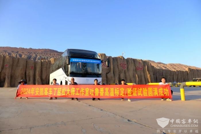 吐魯番地勢(shì)多變、溝壑縱橫,山谷、河流、沙地……地形起伏,路況復(fù)雜,不僅是對(duì)車輛安全性與耐用性的極限挑戰(zhàn),更是對(duì)測(cè)試團(tuán)隊(duì)智慧與勇氣的深度試煉。擔(dān)任本次試驗(yàn)重任的是安凱客車丁延松汽車試驗(yàn)技能大師工作室,其團(tuán)隊(duì)成員熟悉國家各項(xiàng)汽車試驗(yàn)標(biāo)準(zhǔn)要求,歷經(jīng)“四高一山”挑戰(zhàn),斗嚴(yán)寒、戰(zhàn)高溫、涉險(xiǎn)峻,圓滿完成了多項(xiàng)測(cè)試任務(wù)。