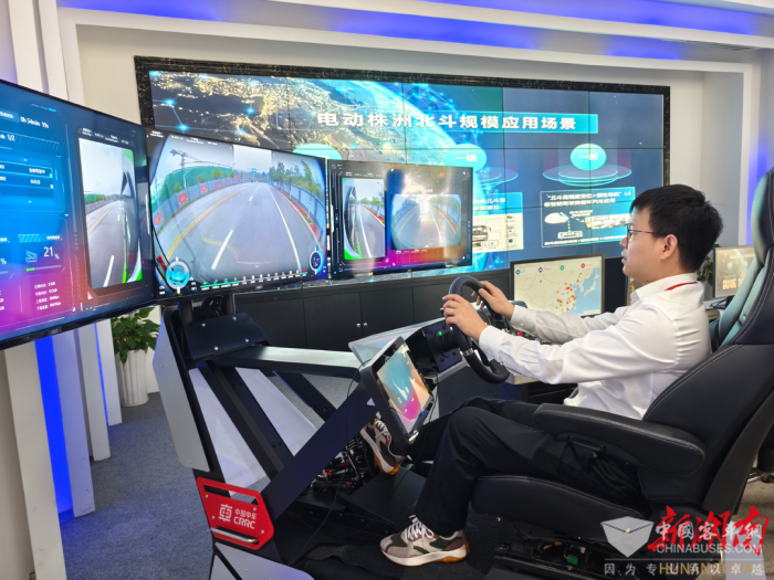 駕駛員在株洲的遠(yuǎn)程駕駛艙,操控位于長沙的公交車
