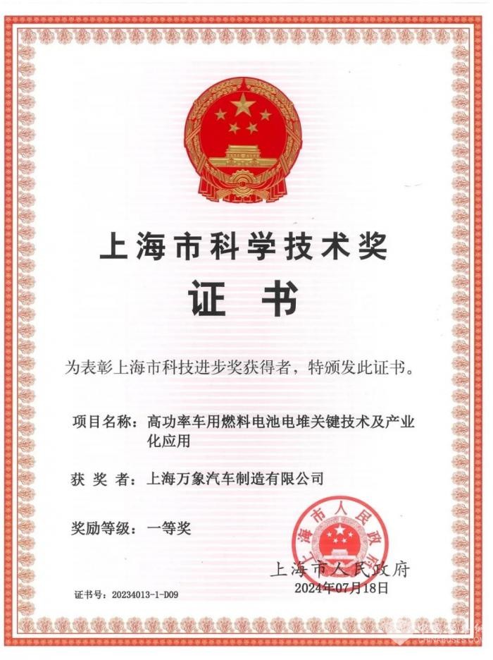 2024年10月23日,2023年度上海市科學技術獎公布,由上海萬象汽車制造有限公司與上海交通大學等10家單位共同完成的《高功率車用燃料電池電堆關鍵技術及產品化應用》項目獲2023年度上海市科技進步獎一等獎。