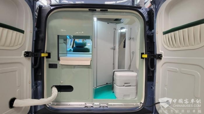 車內(nèi)還設(shè)置了廚房區(qū)、衛(wèi)生間區(qū),冰箱,電磁爐、儲物柜、馬桶,以及淋浴花灑等設(shè)備一應(yīng)俱全,可輕松滿足假日旅行中烹飪美食和日常洗漱的需求。