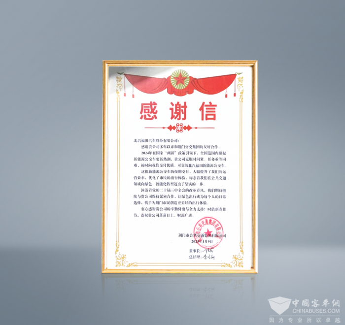中國(guó)客車網(wǎng)2025年1月20日獲悉,近日,福田歐輝客車收到了來(lái)自荊門(mén)公交集團(tuán)的感謝信和獎(jiǎng)牌表彰。