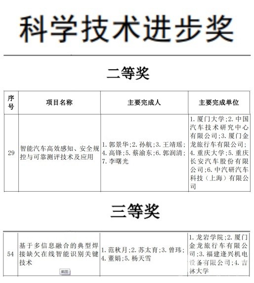 中國(guó)客車(chē)網(wǎng)2025年2月28日獲悉,近日,2023年度福建省科學(xué)技術(shù)獎(jiǎng)獲獎(jiǎng)名單正式揭曉,金旅客車(chē)再獲兩項(xiàng)大獎(jiǎng)。其中,由金旅客車(chē)聯(lián)合廈門(mén)大學(xué)、中國(guó)汽車(chē)技術(shù)研究中心有限公司等機(jī)構(gòu)共同完成的“智能汽車(chē)高效感知、安全規(guī)控與可靠測(cè)評(píng)技術(shù)及應(yīng)用”項(xiàng)目榮獲科學(xué)技術(shù)進(jìn)步獎(jiǎng)二等獎(jiǎng);由金旅客車(chē)聯(lián)合龍巖學(xué)院、吉林大學(xué)等合作完成的“基于多信息融合的典型焊接缺欠在線(xiàn)智能識(shí)別關(guān)鍵技術(shù)”榮獲科學(xué)技術(shù)進(jìn)步獎(jiǎng)三等獎(jiǎng)。這是福建省對(duì)金旅在智能網(wǎng)聯(lián)汽車(chē)領(lǐng)域技術(shù)創(chuàng)新和智能制造領(lǐng)域工藝升級(jí)的重要肯定,標(biāo)志著金旅客車(chē)在自動(dòng)駕駛核心技術(shù)研發(fā)方面取得突破性進(jìn)展,也是金旅在全力打造智慧工廠(chǎng),助推企業(yè)從“制造”轉(zhuǎn)型升級(jí)為“智造”的生動(dòng)注解。