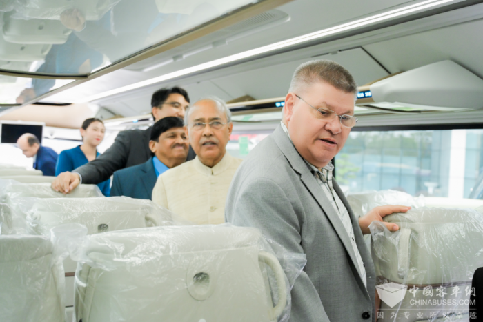 隨后,代表團(tuán)來(lái)到展車(chē)區(qū),近距離參觀金龍各系列車(chē)型,涵蓋新能源客車(chē)、旅游大巴、城市公交等。產(chǎn)品負(fù)責(zé)人現(xiàn)場(chǎng)介紹了車(chē)輛性能、技術(shù)優(yōu)勢(shì)及應(yīng)用場(chǎng)景,特別強(qiáng)調(diào)金龍?jiān)诰G色出行領(lǐng)域的成果,其新能源客車(chē)已廣泛應(yīng)用于全球多個(gè)城市,為緩解交通擁堵、減少碳排放貢獻(xiàn)力量。