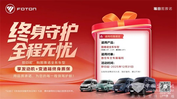 客車網(wǎng)2025年7月8日獲悉,近日,圖雅諾輕客重磅宣布:即日起至2025年12月31日,凡購買圖雅諾全系車型(以購車發(fā)票時(shí)間為準(zhǔn))的首任車主,均可享受發(fā)動(dòng)機(jī)+變速箱終身質(zhì)保服務(wù)。這項(xiàng)覆蓋歐康2.0T/2.5T、康明斯2.8T等動(dòng)力配置的質(zhì)保方案,不僅是對(duì)自身技術(shù)實(shí)力的硬核背書,更通過構(gòu)建產(chǎn)品全生命周期價(jià)值管理體系,在服務(wù)競(jìng)爭(zhēng)領(lǐng)域樹立起新標(biāo)桿。