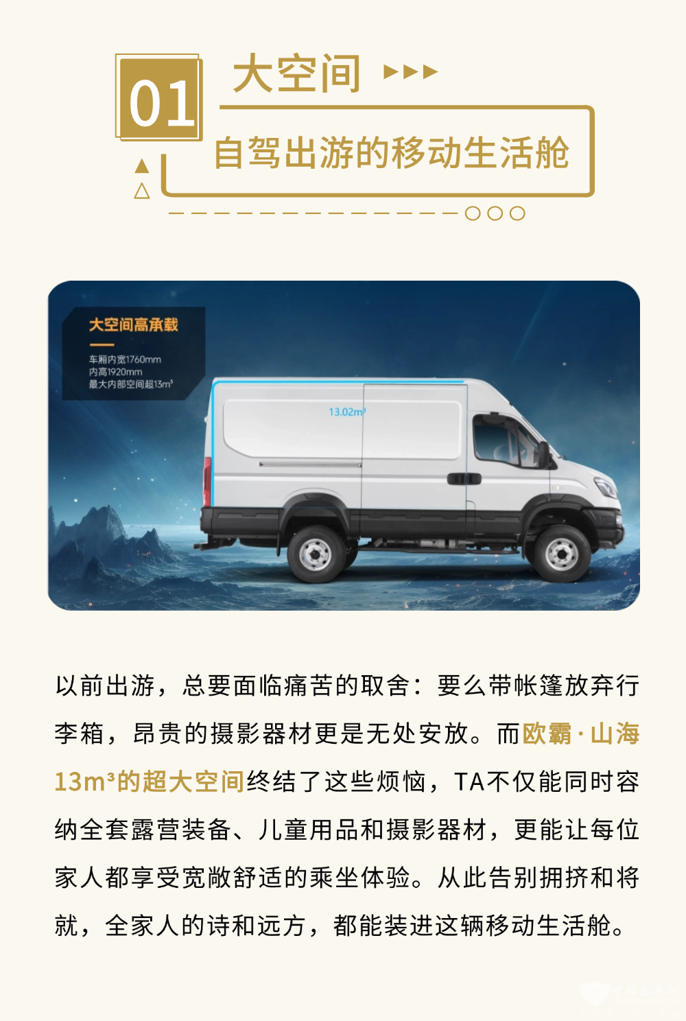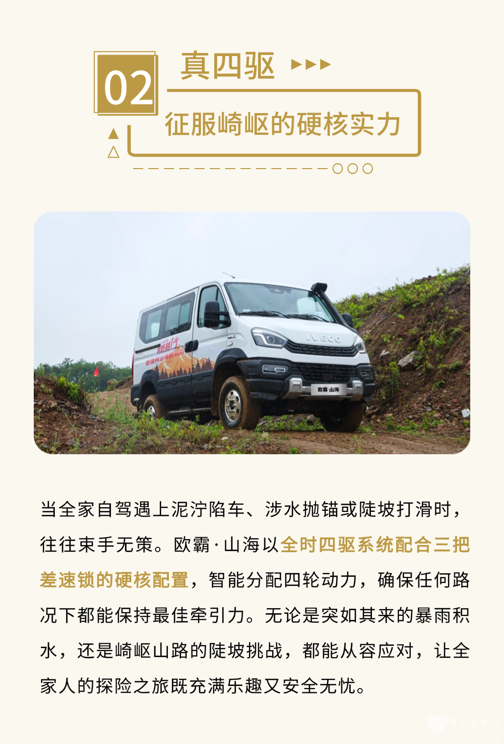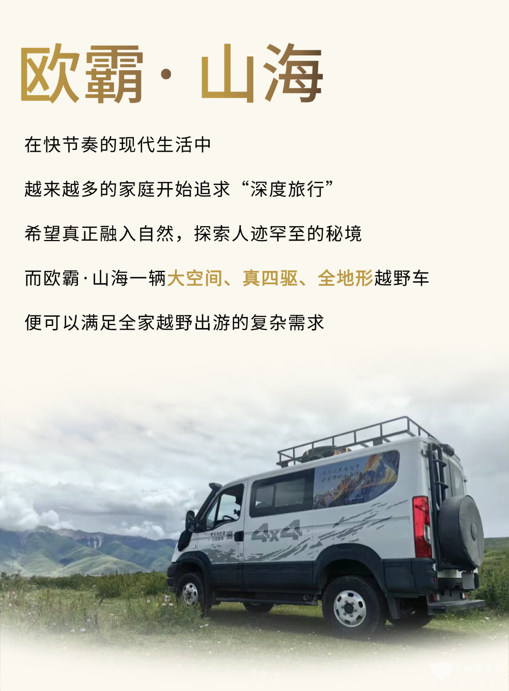 隨著越來越多家庭追求深度旅行,歐霸·山海滿足大空間、真四驅(qū)、全地形的越野車條件,擁有13立方米超大空間,可容納大量裝備,全時(shí)四驅(qū)系統(tǒng)配合三把差速鎖可保持最佳牽引力,超60%爬坡能力搭配專業(yè)越野地盤,輕松應(yīng)對(duì)涉水地形。