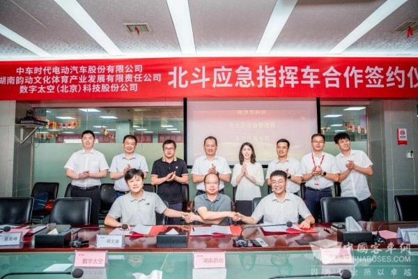 2025年8月28日上午,中車電動與湖南韻動文化體育產(chǎn)業(yè)發(fā)展有限責任公司,數(shù)字太空(北京)科技股份公司三方簽訂合作協(xié)議,中車電動研發(fā)生產(chǎn)的北斗應(yīng)急(科普)指揮車正式交付。株洲市科學技術(shù)協(xié)會副主席楊佳,天元區(qū)應(yīng)急管理局黨委書記劉劍,天元區(qū)商務(wù)局黨組書記、局長易飛翡等見證簽約。