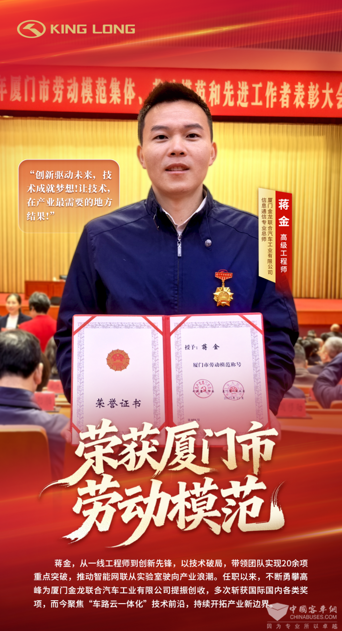 2025年12月18日,廈門(mén)市勞動(dòng)模范集體、勞動(dòng)模范和先進(jìn)工作者表彰大會(huì)舉行,一批在全市經(jīng)濟(jì)社會(huì)發(fā)展各條戰(zhàn)線上作出突出貢獻(xiàn)的先進(jìn)典型受到表彰。其中,廈門(mén)金龍聯(lián)合汽車(chē)工業(yè)有限公司信息通信專(zhuān)業(yè)總師蔣金獲評(píng)廈門(mén)市勞動(dòng)模范,成為制造業(yè)科技創(chuàng)新一線勞動(dòng)者的代表之一。