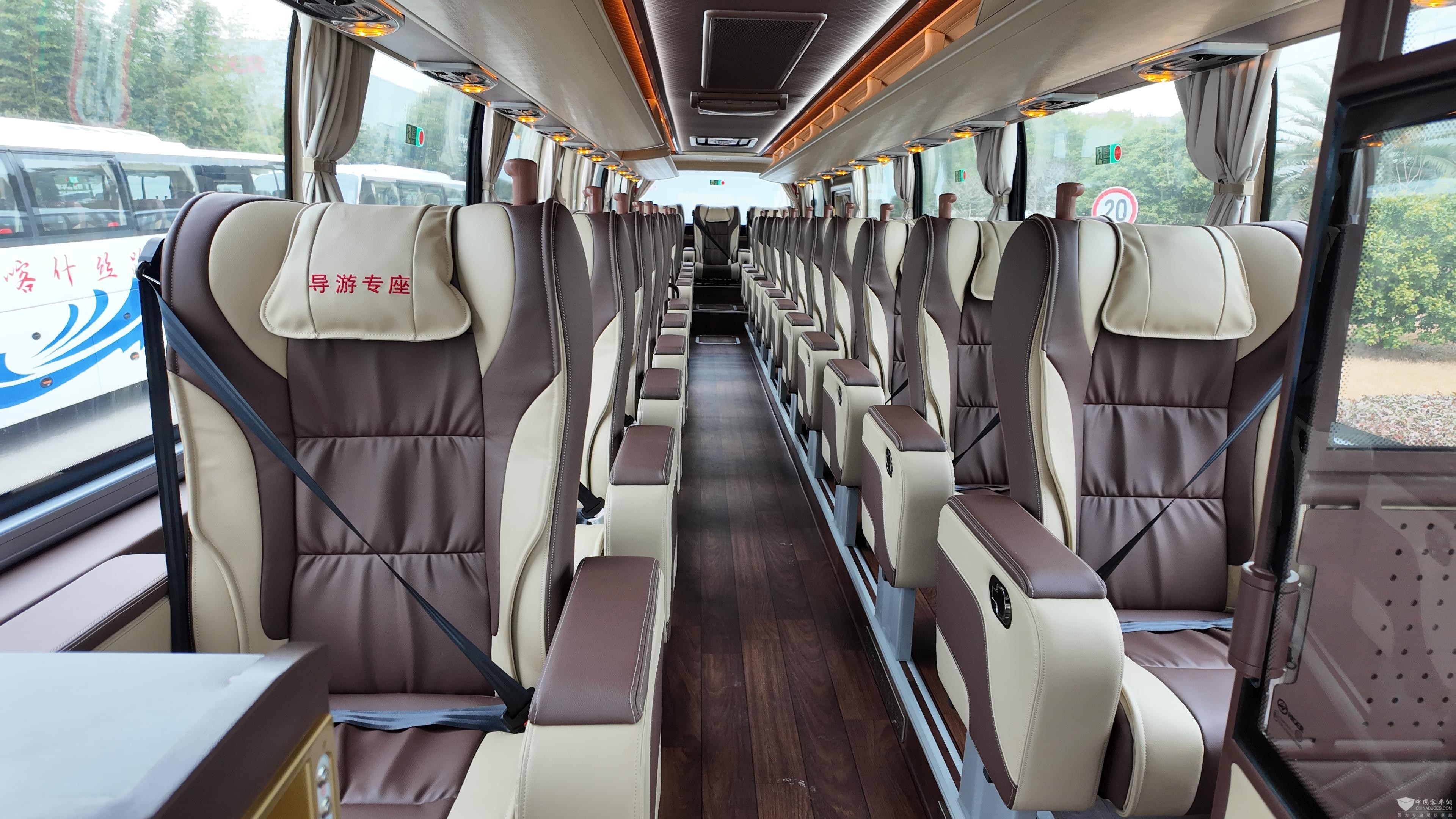 當(dāng)被問及新V系還有什么打動(dòng)人心的地方,何麗笑著提到了一個(gè)詞——“移動(dòng)影院”。車內(nèi)采用“2+1”座椅布局,專為高端旅游市場(chǎng)量身定制。據(jù)介紹這批客車旨在滿足國內(nèi)精品游、長(zhǎng)線游及個(gè)性化定制線路的需求,因此對(duì)車內(nèi)空間、USB充電接口、飲水機(jī)及智能座艙系統(tǒng)等配置均提出高要求,以期為乘客帶來更加卓越的旅途體驗(yàn)。并且新V系的內(nèi)飾設(shè)計(jì)徹底顛覆了傳統(tǒng)客車的沉悶。新中式風(fēng)格、氛圍燈、更符合人體工學(xué)的座椅,甚至被游客評(píng)價(jià)為像“移動(dòng)影院”。