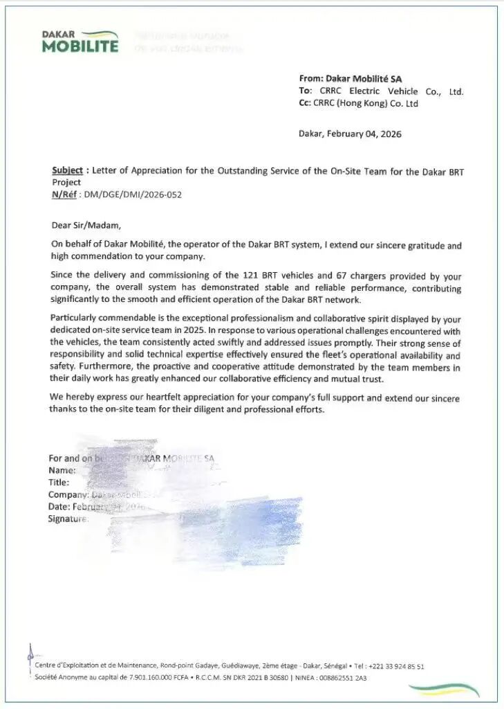 達喀爾運營商在信中表示:“自121輛BRT車輛交付以來整體系統(tǒng)運行穩(wěn)定可靠為達喀爾BRT網(wǎng)絡的順暢高效運營作出了重要貢獻特別值得贊揚的是現(xiàn)場服務團隊展現(xiàn)出卓越的專業(yè)素養(yǎng)與協(xié)作精神面對各類運營挑戰(zhàn)響應迅速、處理及時有效保障了車隊的高效運行與安全”