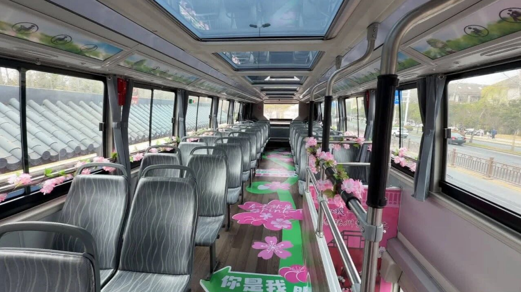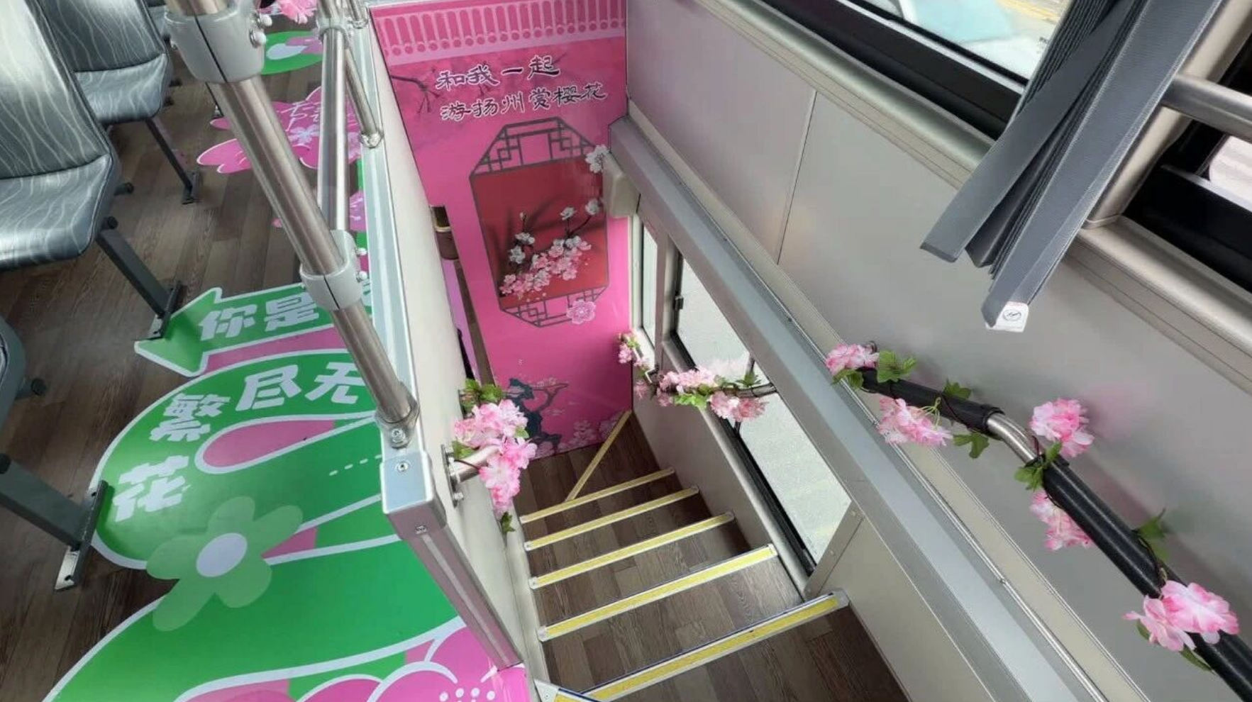 揚(yáng)州公交集團(tuán)營(yíng)運(yùn)服務(wù)部主管王晨軍介紹:“我們對(duì)整個(gè)車(chē)輛進(jìn)行了專(zhuān)項(xiàng)改裝,以櫻花的粉色為底色,車(chē)內(nèi)布置了大量櫻花圖片,所有座椅也全部更換為軟座,進(jìn)一步提升了乘客的舒適度。”不僅如此,車(chē)輛雙層設(shè)計(jì)使乘客能夠從更高的視角俯瞰街道兩側(cè)盛開(kāi)的櫻花,上層前排座位更是一票難求——坐在那里,整條櫻花大道仿佛就在觸手可及之處緩緩鋪展,每一幀都是可以存檔的春日畫(huà)面。