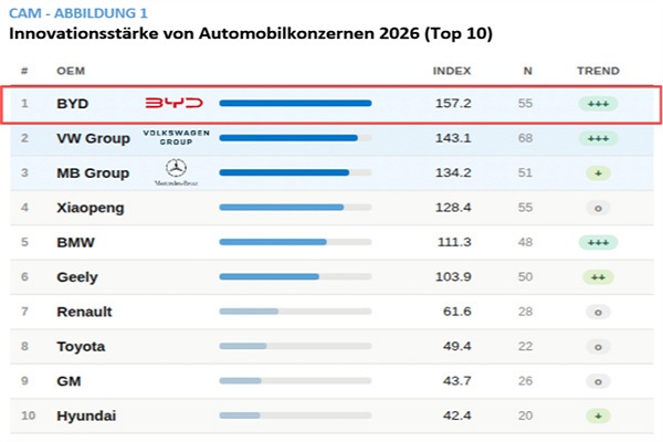 德國(guó)汽車(chē)管理中心CAM自2005年啟動(dòng)“汽車(chē)創(chuàng)新研究”榜單,比亞迪此次登頂,成為該榜單創(chuàng)立以來(lái)首家拿下全球冠軍的中國(guó)企業(yè)。
