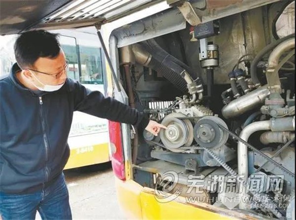 當(dāng)日,在該首末站,記者見到了蕪湖公交四分公司惲副經(jīng)理。他和1路公交車隊(duì)長(zhǎng)傅吉桂打開了一輛停在車場(chǎng)的公交車車尾發(fā)動(dòng)機(jī)倉(cāng)蓋,向記者進(jìn)行了講解演示。原來,發(fā)動(dòng)機(jī)倉(cāng)內(nèi)大致可見到3部分,左邊為車載空調(diào)壓縮機(jī)、中間為發(fā)動(dòng)機(jī),右邊是帶風(fēng)扇的水箱。惲副經(jīng)理指著空調(diào)壓縮機(jī)告訴記者:“雖然車載空調(diào)防疫以來均未使用,但是它的動(dòng)力皮帶和發(fā)動(dòng)機(jī)還是相連,發(fā)動(dòng)機(jī)在工作時(shí),這個(gè)動(dòng)力皮帶就會(huì)帶動(dòng)過渡輪轉(zhuǎn)動(dòng),不過空調(diào)沒有打開的情況下就是空轉(zhuǎn),當(dāng)天2路車出問題的地方就是這個(gè)過渡輪軸承壞死無法轉(zhuǎn)動(dòng),導(dǎo)致這條動(dòng)力皮帶摩擦過度,最終磨斷,這一過程中不斷磨碎的皮帶粉末被風(fēng)扇吹到倉(cāng)外,看起來在冒黑煙,事實(shí)上這種傳動(dòng)皮帶一般不會(huì)起火,而空調(diào)壓縮機(jī)與發(fā)動(dòng)機(jī)相對(duì)獨(dú)立,也沒有油路經(jīng)過,不會(huì)發(fā)生滴漏油導(dǎo)致起火。”