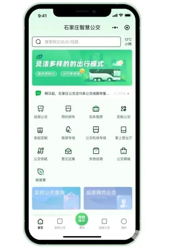 推進(jìn)公交線路進(jìn)醫(yī)院、進(jìn)景區(qū)、進(jìn)商圈、進(jìn)企業(yè)、進(jìn)學(xué)校、進(jìn)社區(qū),為市民提供“點(diǎn)對(duì)點(diǎn)”“門到門”的出行服務(wù);開(kāi)通“適老化”線路,升級(jí)打造“敬老愛(ài)心”線路;開(kāi)通小學(xué)生免費(fèi)專線;為石家莊舉辦的各類大型活動(dòng)提供運(yùn)力保障;全新升級(jí)上線的“石家莊智慧公交”App,為市民提供全景展現(xiàn)、出行預(yù)測(cè)、出行定制等一系列智能化服務(wù);創(chuàng)新支付和票務(wù)系統(tǒng),推廣移動(dòng)支付、刷臉支付等無(wú)現(xiàn)金支付方式,簡(jiǎn)化辦卡、購(gòu)票流程,電子支付率達(dá)到90%;定期對(duì)駕駛員進(jìn)行職業(yè)素養(yǎng)、服務(wù)態(tài)度及安全駕駛培訓(xùn),實(shí)施星級(jí)評(píng)定制度,建立乘客投訴快速響應(yīng)機(jī)制;在車廂提供手機(jī)充電、無(wú)線網(wǎng)絡(luò)等服務(wù),在站臺(tái)安裝便民候車座椅,開(kāi)設(shè)公交供銷鋪、智能售卡售貨設(shè)備等,從細(xì)微處為百姓出行提供便捷。