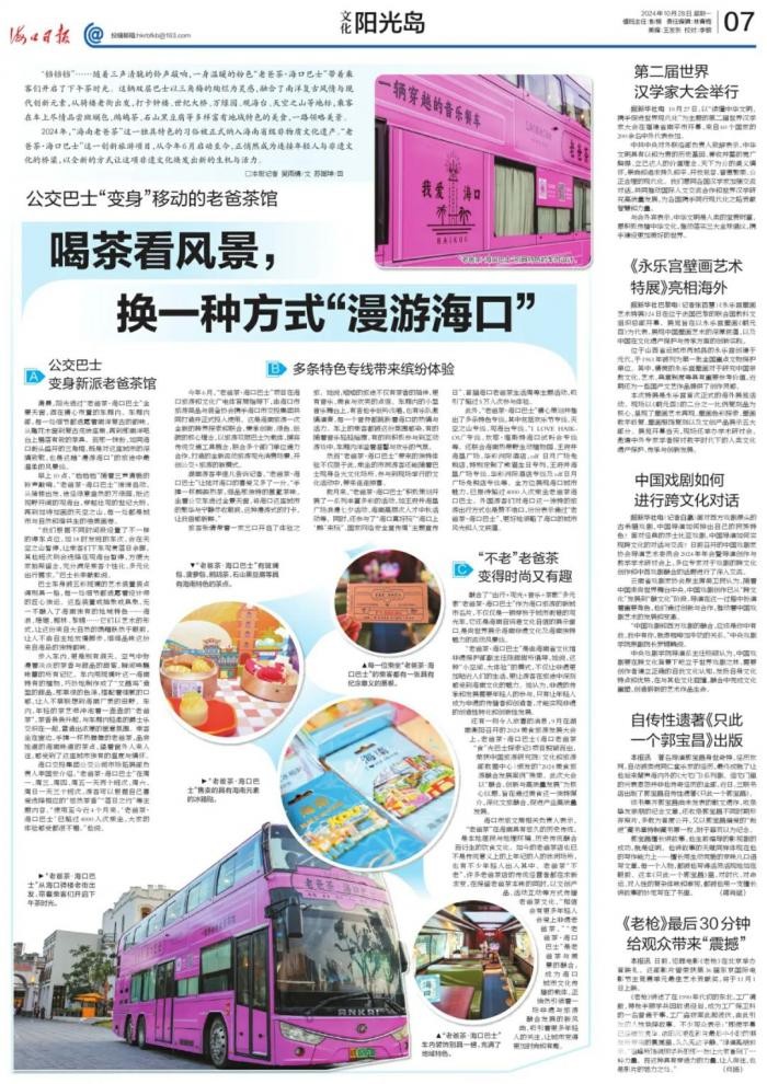 清晨,陽光透過“老爸茶·海口巴士”全景天窗,灑在精心布置的車廂內(nèi)。車廂內(nèi)部,每一處細(xì)節(jié)都透露著南洋復(fù)古的韻味,從雕花木窗到復(fù)古皮質(zhì)座椅,再到那南洋吧臺上錯(cuò)落有致的茶具。而那一抹粉,如同??诮诸^盛開的三角梅,既是對這座城市的深情致敬,也是這趟“漫游???rdquo;的旅途中最溫柔的風(fēng)景線。早上10點(diǎn),“鐺鐺鐺”隨著三聲清脆的鈴聲敲響,“老爸茶·??诎褪?rdquo;緩緩啟動。從騎樓出發(fā),途經(jīng)綠意盎然的萬綠園,抵達(dá)視野開闊的觀海臺,穿越壯觀的世紀(jì)大橋,再到如詩如畫的天空之山,每一處都是城市與自然和諧共生的絕美畫卷。“我們根據(jù)不同時(shí)間段設(shè)置了不一樣的停車點(diǎn)位,如18時(shí)發(fā)班的車次,會在天空之山暫停,讓乘客們下車觀賞落日余暉,其他班次則會選擇在觀海臺暫停,方便大家拍照留念,充分滿足乘客個(gè)性化、多元化出行需求。”巴士長李獻(xiàn)戟說。巴士車身被五彩斑斕的藝術(shù)裝置裝點(diǎn)得別具一格,每一處細(xì)節(jié)都透露著設(shè)計(jì)師的匠心獨(dú)運(yùn)。這些裝置或抽象或具象,無一不融入了海南獨(dú)有的地域特色——海浪、珊瑚、椰林、黎錦……它們以藝術(shù)的形式,讓這份來自大自然的饋贈躍然于眼前,讓人不由自主地放慢腳步,細(xì)細(xì)品味這份來自海島的獨(dú)特韻味。步入車內(nèi),更是別有洞天??諝庵袕浡牟柘闩c甜品的甜蜜,瞬間喚醒味蕾的所有記憶。車內(nèi)用斑斕葉這一海南特有的植物,巧妙地制作成了“文昌雞”造型的甜品,那翠綠的色澤,搭配著細(xì)膩的口感,讓人不禁聯(lián)想到海南廣袤的田野。車內(nèi),年輕的茶藝師沖泡著一壺壺的“老爸茶”,茶香裊裊升起,與車廂內(nèi)輕柔的爵士樂交織在一起,營造出濃厚的愜意氛圍。乘客坐在窗邊,手捧一杯熱騰騰的老爸茶,品嘗地道的海南味道的茶點(diǎn),望著窗外人來人往,感受到了這座城市獨(dú)有的溫度與情懷。