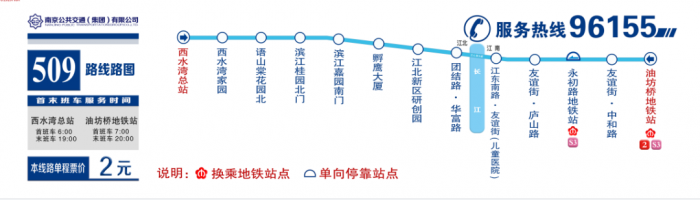 為方便江北新區(qū)研創(chuàng)園板塊及濱江嘉園等小區(qū)市民經(jīng)江心洲大橋跨江出行,進(jìn)一步滿(mǎn)足市民群眾的出行需求,2023年5月9日南京公交509路正式開(kāi)通,成為首條江心洲長(zhǎng)江大橋的公交線路。