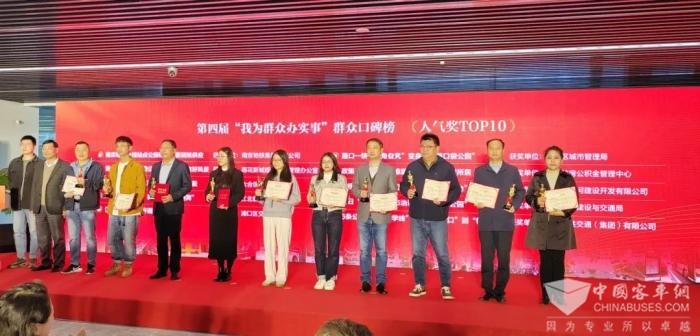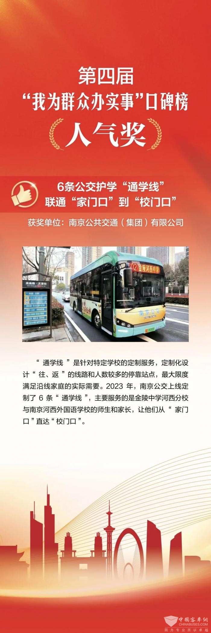 2024年11月7日,在中共南京市委宣傳部、南京市發(fā)展和改革委員會(huì)(市民生辦)、新華報(bào)業(yè)傳媒集團(tuán)指導(dǎo)下,由揚(yáng)子晚報(bào)主辦的長(zhǎng)三角主流媒體走進(jìn)南京江北新主城暨“強(qiáng)富美高”口述史社區(qū)篇啟動(dòng)儀式正式舉辦。南京公交集團(tuán)6條公交“通學(xué)線”項(xiàng)目和長(zhǎng)江五橋開(kāi)通跨江公交項(xiàng)目,在第四屆“我為群眾辦實(shí)事”群眾口碑榜活動(dòng)中,榮獲“人氣獎(jiǎng)”稱(chēng)號(hào)。