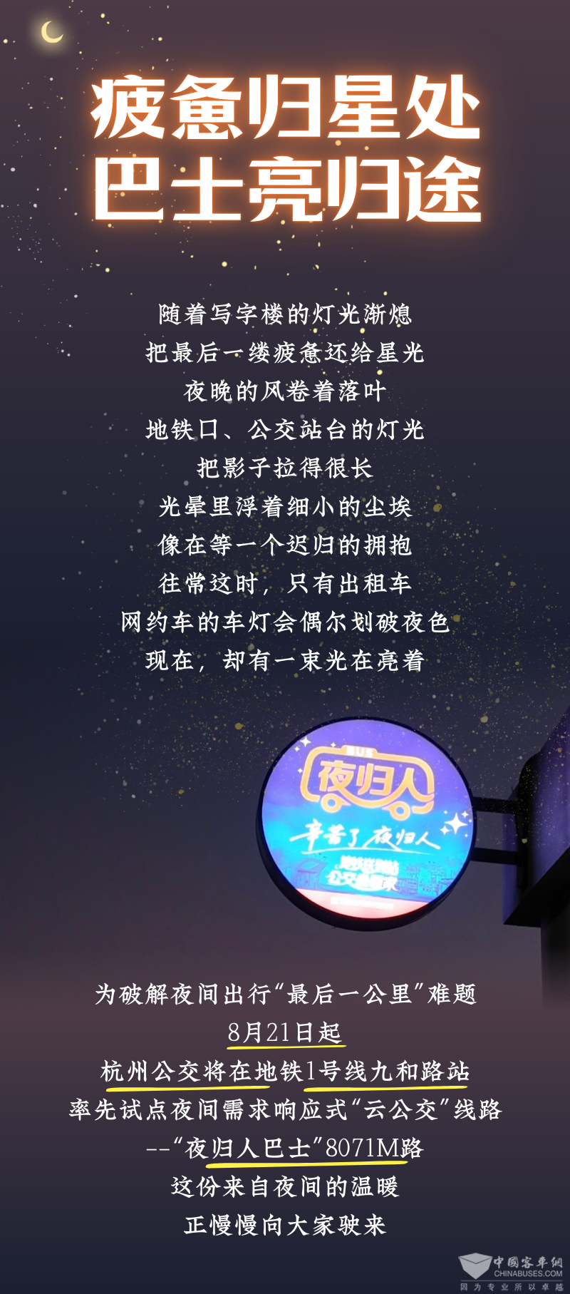 針對(duì)發(fā)現(xiàn)的夜間出行痛點(diǎn),杭州公交將在8月21日起推出“夜歸人巴士” 8071M路。此次“夜歸人巴士”將采用“云公交”的模式,線上線下一體化預(yù)約,通過(guò)需求響應(yīng)式服務(wù)模式實(shí)現(xiàn)市民乘客精準(zhǔn)接駁。