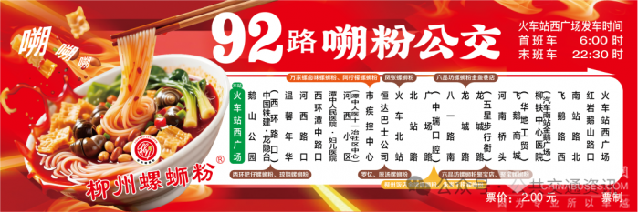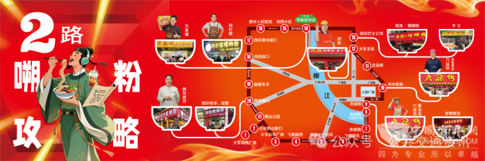 專線最大的亮點在于全面升級的“嗍粉導覽”功能。線路示意圖不再只是站名排列,而是化身為一幅“柳州螺螄粉美食人文地圖”,清晰標注沿途各站點附近的網(wǎng)紅螺螄粉實體店,并通過招商形式展示部分柳州螺螄粉實體店形象代言人的照片。