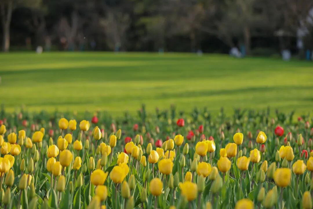 櫻花如云、郁金香似錦,風(fēng)車草坪相映,邂逅初春杭城詩意。