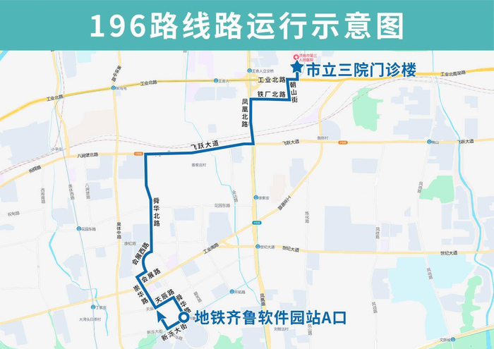 196路由市立三院門診樓開往地鐵齊魯軟件園站A口,主要途經(jīng)王舍人北街、工業(yè)北路、朝山街、鐵廠北路、鳳凰北路、飛躍大道、舜華北路、會展西路、會展路、崇華路,然后單向沿天辰路向東、舜華路向南、新濼大街向西至崇華路向北恢復原線,沿途設(shè)置市立三院門診樓、市立三院、濟南信息工程學校東門、鮑新苑小區(qū)、十八中、鳳凰北路鐵廠北路(路西)、鐵廠北路鳳凰北路(路南)、東潤麗苑、飛躍大道鳳凰北路、飛躍大道宏宇路、地鐵姜家莊站、舜華北路飛躍大道(路西)、飛躍大道舜華北路(路南)、舜華北路中林路、舜華北路輕風路、舜華北路沁園路、新東方花園、新生活家園南區(qū)、崇華路會展路、崇華路工業(yè)南路、天辰路崇華路(路南)、天辰路舜華路(路南)、高新區(qū)政務中心(路西)、地鐵齊魯軟件園站A口(路北)、崇華路新濼大街(路東)站點。