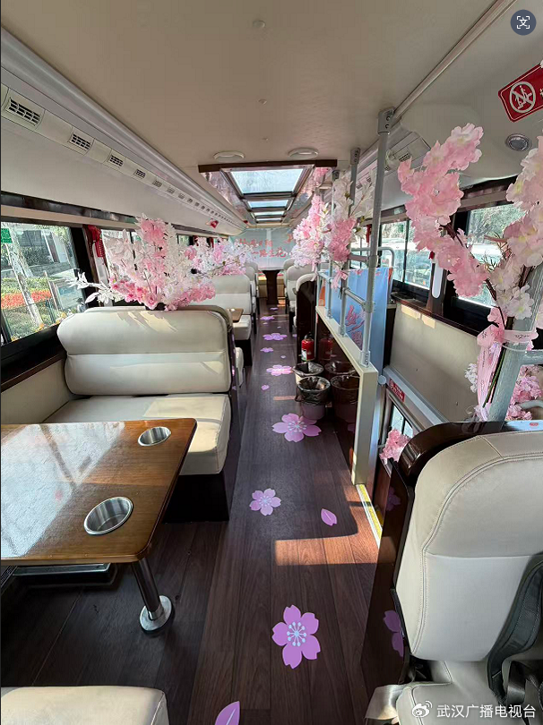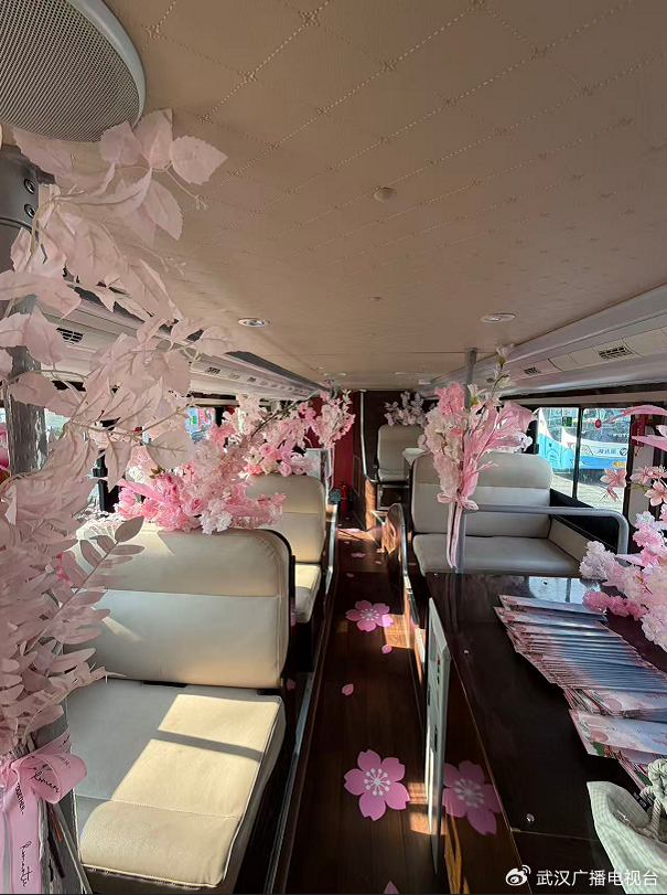 “妙遇漢陽·一路生花”春季觀光巴士,深度融入“江漢攬勝”主題游線,以英倫復(fù)古雙層巴士為載體,串聯(lián)起黃鶴樓、長江大橋、龜山公園、晴川閣等武漢核心賞櫻打卡點,讓你一站式盡覽江漢風(fēng)光與櫻花盛景。走進車廂,春日氣息撲面而來:扶手纏繞著栩栩如生的仿真櫻花枝,車窗點綴著靈動的櫻花貼紙,每一處細節(jié)都藏著春日的溫柔。車輛一層貼心配備免費賞花地圖與巴士紀念車票,讓你在賞櫻之余,留存專屬春日印記。更值得一提的是,行駛途中,專業(yè)導(dǎo)游全程講解景區(qū)千年歷史與獨家游玩攻略,帶你讀懂江城人文底蘊;身著古風(fēng)華服的“花神”“簪花郎”驚喜現(xiàn)身,與游客溫情互動、打卡合影,將古風(fēng)雅韻與春日浪漫完美融合,讓每一段旅程都充滿驚喜與儀式感。