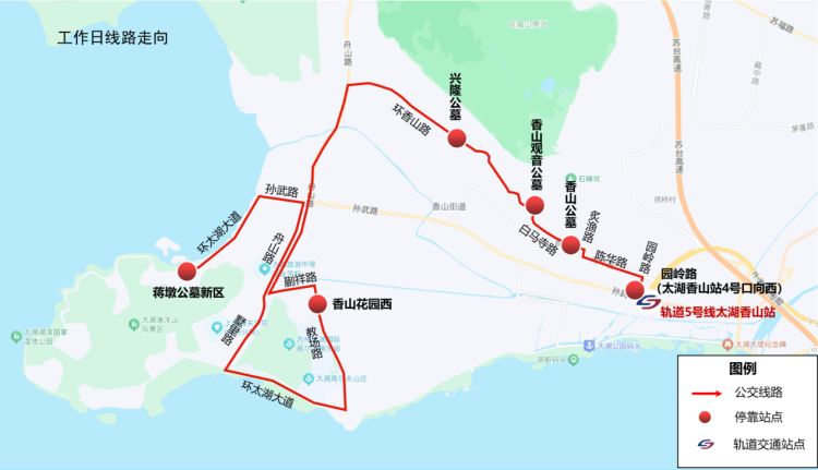 市民乘坐地鐵5號(hào)線至“太湖香山”站,從4號(hào)口出站后向西步行約100米至園嶺路上下客點(diǎn),即可換乘掃墓接駁專線,一站式直達(dá)四大墓區(qū),祭掃結(jié)束后可在下車點(diǎn)原路返回。