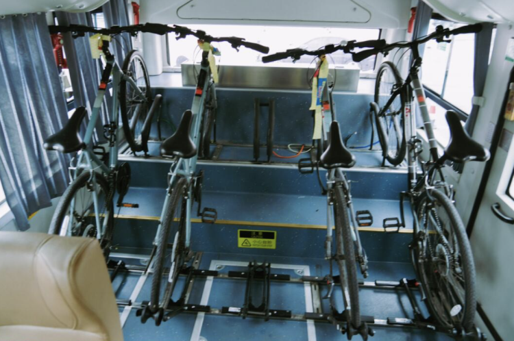 彼時的“1.0版本”使用的是普通公交車,改造方式是在車廂中部加裝橫杠,把自行車掛起來。這個方案能用,但一方面,可容納的自行車數量較少,當時一輛車服務10名車友,另一方面,自行車懸掛后容易晃動,車身可能撞擊玻璃窗,增加了車輛維護難度。