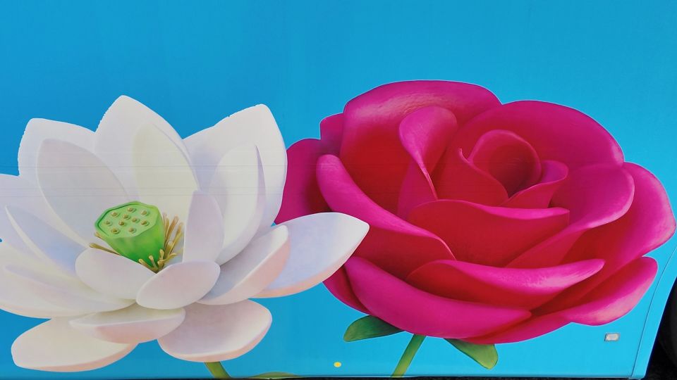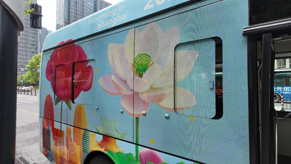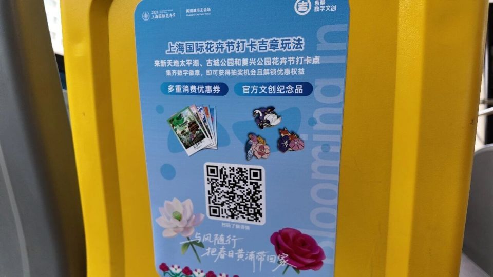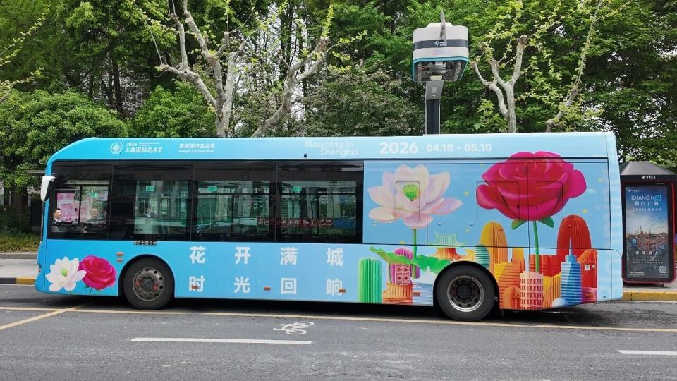 記者在現(xiàn)場(chǎng)看到,這輛 “移動(dòng)大花車”有著清新的天藍(lán)色車身,繪著盛放的荷花與玫瑰,搭配黃浦區(qū)地標(biāo)剪影,還有 “花開滿城 時(shí)光回響” 的字樣,浪漫感直接拉滿!車身頂部還標(biāo)注了 “2026 04.18—05.10” 的專屬運(yùn)營(yíng)時(shí)段,和沿途的春日繁花交相輝映,妥妥的街頭限定風(fēng)景線~