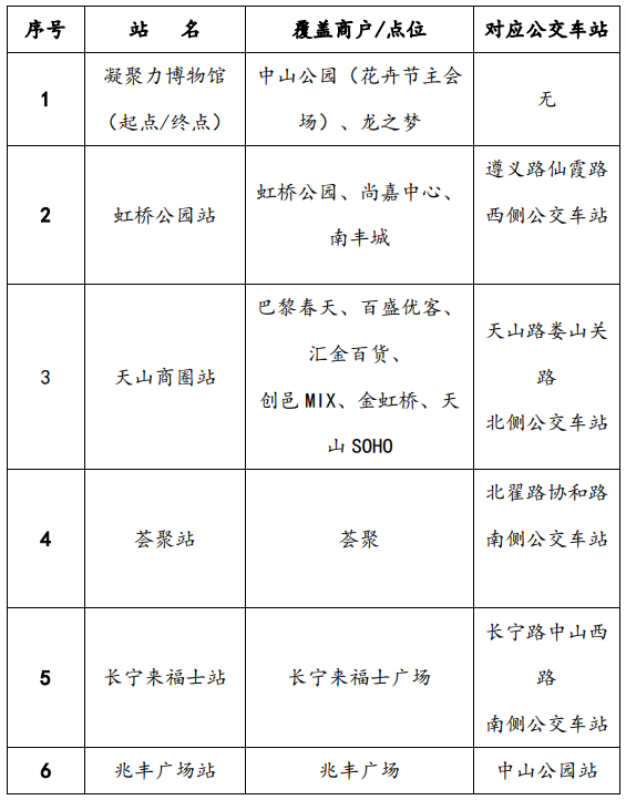 線路以凝聚力工程博物館為起點和終點,沿途停靠虹橋公園站、天山商圈站、薈聚站、長寧來福士站和兆豐廣場站。其中,虹橋公園站周邊有尚嘉中心、南豐城,天山商圈站覆蓋巴黎春天、百盛優(yōu)客、金虹橋等商業(yè)體,薈聚站直達薈聚購物中心,長寧來福士站可到達來福士廣場,兆豐廣場站則緊鄰中山公園商圈。每個??奎c均對應現(xiàn)有公交車站,方便市民上下車。