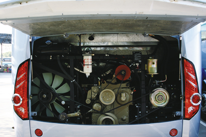 作為一款長度將近11m的團體旅游客車來說,其整車外形大氣恢弘。大型風(fēng)窗玻璃為駕駛員提供了良好視野,前臉輪廓線與側(cè)窗玻璃下沿線流暢連接,整體感很強。整車的結(jié)構(gòu)設(shè)計采用了沃爾沃車身結(jié)構(gòu)技術(shù)和研發(fā)流程,滿足沃爾沃強度試驗方面的各種規(guī)定。由于全車身采用了側(cè)蒙皮及頂角蒙皮滾壓技術(shù)、其平整度及接縫工藝極佳。來到車后方,還是車燈吸引了我們,倒車燈、制動燈組采用側(cè)排設(shè)計,也許這是申沃客車車燈設(shè)計的主導(dǎo)思路,亦是為了和車身側(cè)圍完美的銜接。