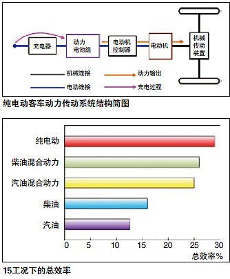 在石油資源日漸減少且不可再生的今天,純電動客車與燃料電池客車選用電能驅(qū)動車輛運行,從而擺脫了客車對于傳統(tǒng)石油燃料的依賴。這兩種電動客車在運行時可實現(xiàn)污染物的零排放,而且噪聲低、振動小,乘坐舒適性好。同時,根據(jù)日本相關(guān)權(quán)威機構(gòu)的研究結(jié)果,從汽車各種動力系統(tǒng)的綜合效率分析,電動汽車的的綜合效率最高。