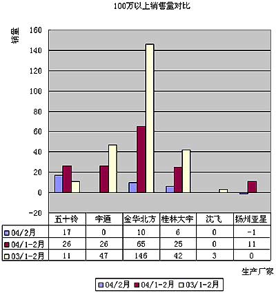 下表是04年1-2月份金華北方、廣州五十鈴、桂林大宇和宇通100萬(wàn)以上各車型銷量情況: