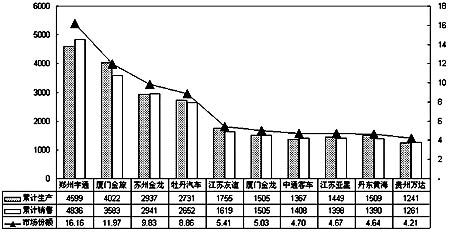 表一:2004年1-4月份客車企業(yè)累計總銷量前十名企業(yè)總產(chǎn)銷量及市場份額