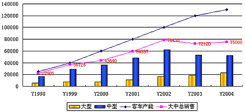 大型客車連續(xù)三年以平均30%的速度增長(zhǎng),大型客車占大中型客車的比例由2001年的14.8%上升為2004年的33.2%,足矣顯示客車大型化趨勢(shì),這與我國(guó)客車發(fā)展方向保持一致。由于高速公路的發(fā)展,人民生活水平的提高,對(duì)客車檔次和乘坐舒適性提出更高的要求,加之,大中型客車廠商競(jìng)爭(zhēng)加劇,促進(jìn)了客車產(chǎn)品質(zhì)量和檔次的提高。