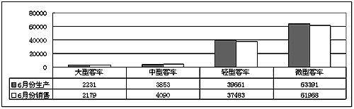 6月份總體銷售客車107095輛,比5月份下降2.15%。其中,6月份銷售大型客車2179輛,比5月份增長15.54%。中型客車4090輛,比5月份增長8.69%。輕型客車37483輛,比5月份下降7.75%。微型汽油客車61968輛,比5月份增長8.30%。