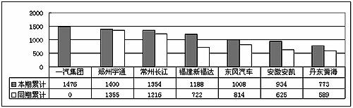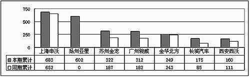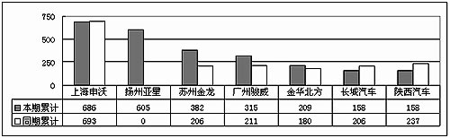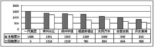 2004年1~6月份大型客車銷量對(duì)比(前7家企業(yè)) 單位:輛