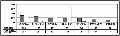 2004年1~6月份大型客車產(chǎn)量對(duì)比(第8~14家企業(yè)) 單位:輛